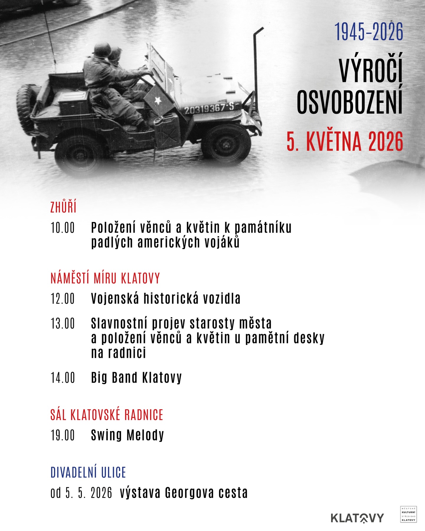 Připomeňme si společně 81 let od osvobození našeho města a uctěme památku těch, kteří přinesli svobodu. V úterý 5. května 2026 si v Klatovech připomeneme tyto významné události pietními akty i doprovodným programem: 🕊️ Pietní akty: • 10:00 – Položení věnců u památníku padlých amerických vojáků na Zhůří • 13:00 – Slavnostní projev starosty a položení věnců a květin u radnice 🎖️ Program na náměstí Míru: • 12:00–13:30 – Vojenská historická vozidla 🎶 Hudební program: • 14:00 – Big Band Klatovy • 19:00 – Swing Melody (sál radnice) 🖼️ Doprovodný program: • od 5. 5. – výstava „Georgova cesta“ (Divadelní ulice) Přijďte si připomenout chvíle, které utvářely naši historii, a uctít památku těch, na které nesmíme zapomenout. (Zapsal: Jiří Tománek, 27.04.26) | ||
