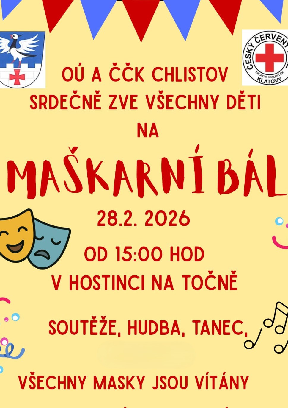 OÚ a ČČK Chlistov zve všechny děti na MAŠKARNÍ BÁL. Soutěže hudba. Masky vítány.