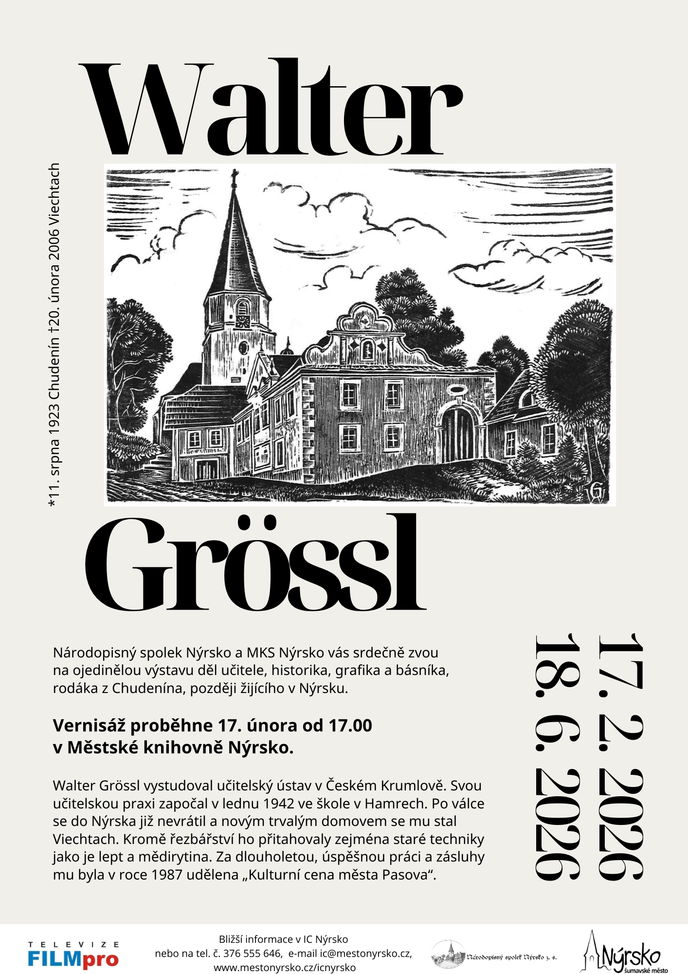Národopisný spolek Nýrsko a MKS Nýrsko srdečně zvou na ojedinělou výstavu děl učitele, historika, grafika a básníka, rodáka z Chudenína (později žijícího v Nýrsku). Díla po vernisáži budou k vidění v Městské knihovně v Nýrsku. Vernisáž proběhne 17. února od 17.00 v městské knihovně, účast přislíbily dcery Edith Künzel a Christa-Marie Ebert. Walter Grössl vystudoval učitelský ústav v Českém Krumlově. Svou učitelskou praxi započal v lednu 1942 ve škole v Hamrech. Po válce se do Nýrska již nevrátil a novým trvalým domovem se mu stal Viechtach, kam za ním přišli rodiče i bratr. Ve Viechtachu se vrátil k učitelskému povolání, kterému zůstal věrný až do odchodu do důchodu. Ve volném čase se věnoval své vášni, řezbářství. Do dřeva ryl krajiny Šumavy a Bavorského lesa. Inspirovala ho poezie Hanse Watzlika a Seppa Skalitzkého. Rozhodující roli sehrál obdiv k Adalbertu Stifterovi a jeho dílům. Kromě řezbářství ho přitahovaly zejména staré techniky, jako je lept a mědirytina. Už tehdy kritici potvrdili, že jeho dílo „spojuje hluboký cit s mimořádnou dovedností“. Za jeho dlouholetou, úspěšnou práci a zásluhy mu byla v roce 1987 udělena „Kulturní cena města Pasova“. (Zapsal: INFORMAČNÍ CENTRUM NÝRSKO, 03.02.26) | ||