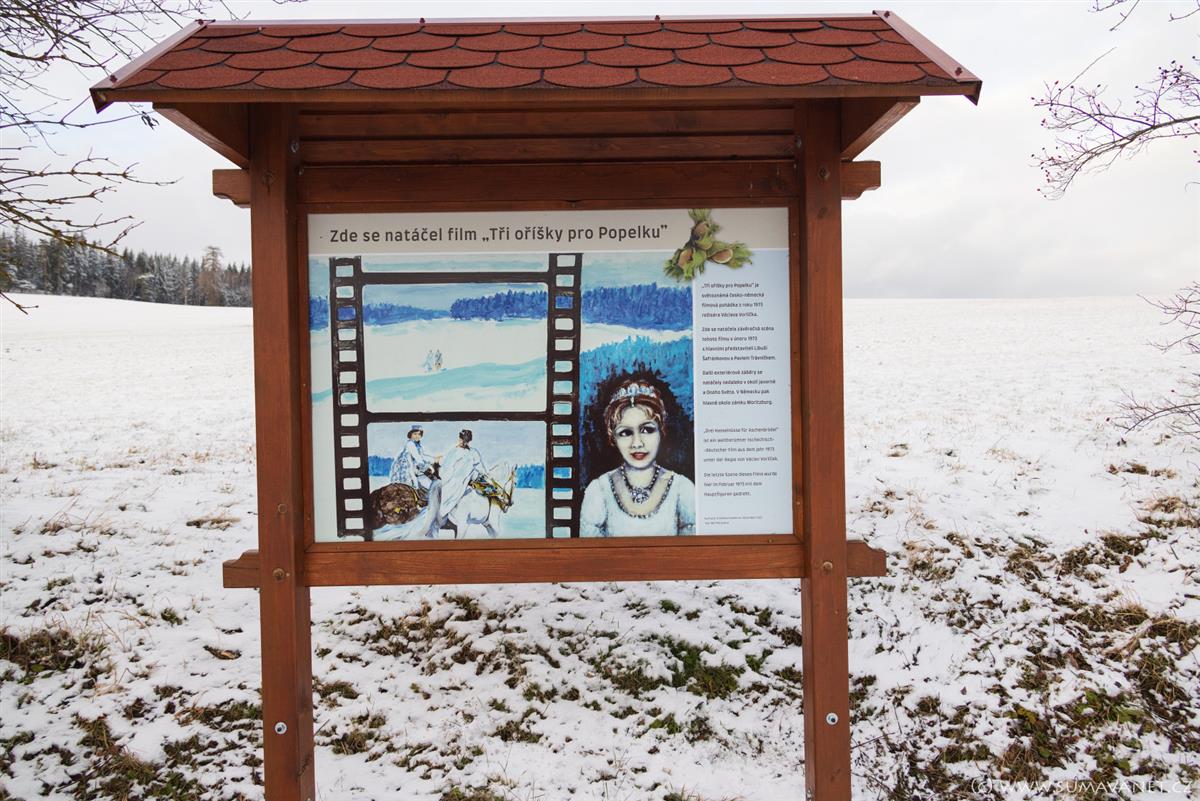 Pohádku Tři oříšky pro Popelku si většina z nás spojuje s hradem Švihov (domov Popelky) a zámkem Moritzburg (domov prince). Málokdo ale ví, že řada scén se natáčela také v malebném okolí Čachrova a Javorné na Šumavě. Pokud pojedete autem z Klatov na Železnou Rudu, zastavte se u osady Jesení, kde v roce 1973 vznikla ikonická závěrečná scéna pohádky. Právě zde princ a Popelka společně odjíždějí na koních zasněženou krajinou.