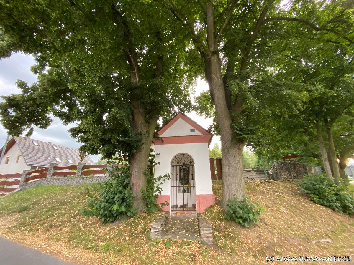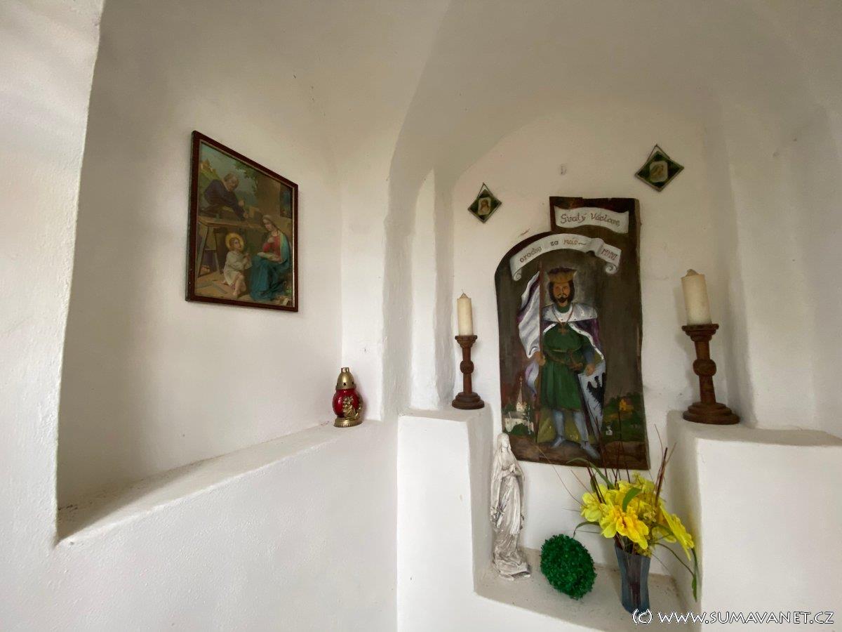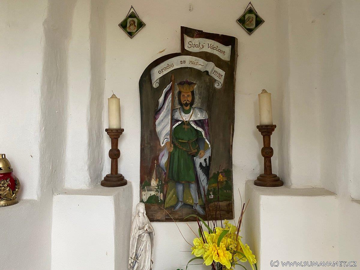 Původní socha světce byla odcizena, poté nalezena v sousedním Německu a následně uložena v depozitáři klatovského muzea. Na jejím místě je umístěna malba na dřevěné desce, kterou vytvořila členka místního Sokola Mgr. Xenie Begerl. Rovněž soustružené svícny darovali členové Sokola a společně s věřícími se starají o vnitřní výzdobu.