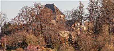 Romantická zřícenina kostela z roku 1370 na vrchu nad obcemi Běšiny a Tržek