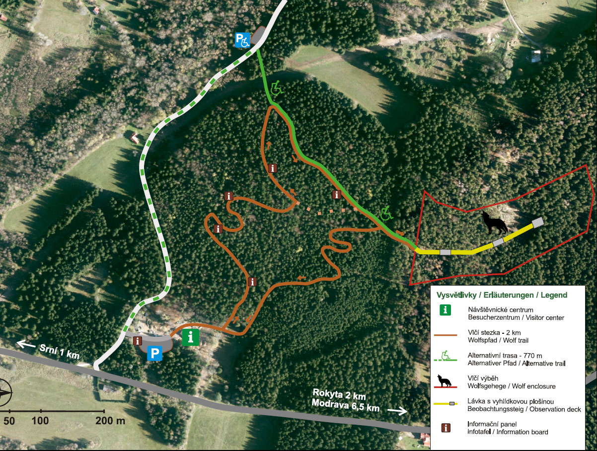 Hlavní součástí je pěší okruh s odpočinkovými místy a navigačním systémem. Mysleli jsme i na tělesně postižené, kteří mají přístup do výběhu vlků ze samostatného parkoviště a po přístupnější části pěšího okruhu. Je ale vhodné, aby měli asistenci. Ti, kteří ani toto nezvládnou, mohou vidět vlky na velkoplošné obrazovce na kterou je přenášen živý obraz přímo z výběhu v budově návštěvnického centra.