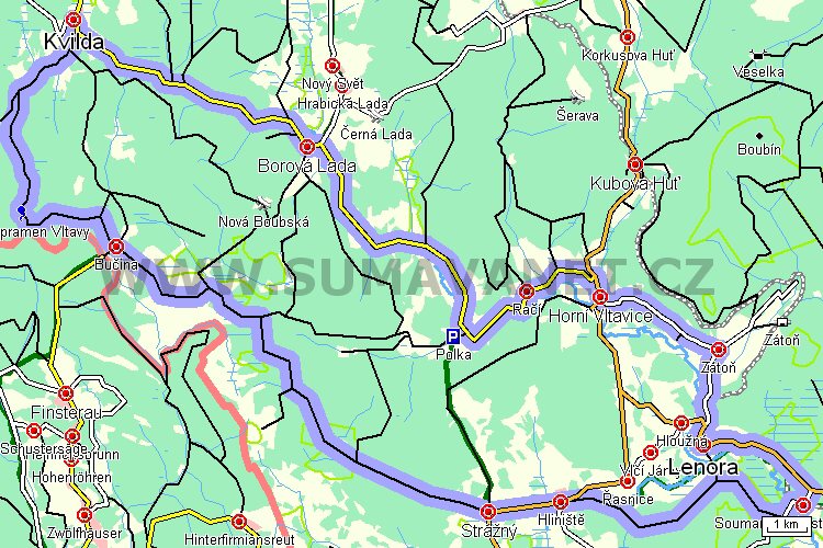 Kvilda | Kvilda - Hraběcí huť | pramen Vltavy | U pramene Vltavy | Bučina | Furik | Knížecí Pláně - rozc. | Knížecí Pláně | Žďárské sedýlko | Žďárské jezírko | Strážný | Hliniště | mlýn Řasnice | Zelená cesta | Vorarské šance | Soumarský most | Lenora | Zátoň | Pod Mlýnským vrškem | Horní Vltavice | Račí | Borová Lada | Svinná Lada | Kvilda