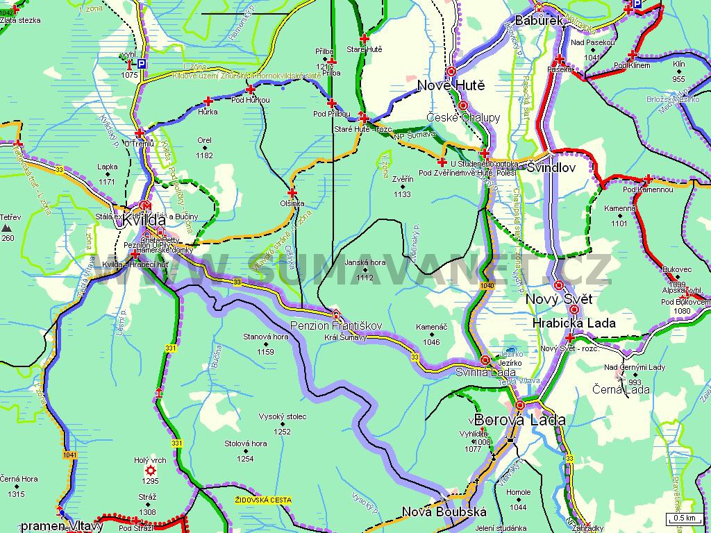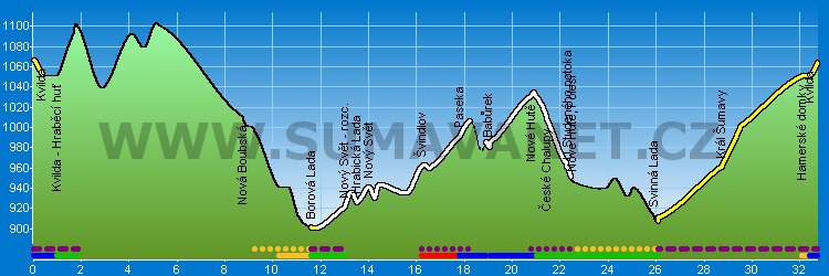 Kvilda | Kvilda - Hraběcí huť | Nová Boubská | Borová Lada | Nový Svět - rozc. | Hrabická Lada | Nový Svět | Švindlov | Paseka | Babůrek | Nové Hutě | České Chalupy | U Studeného potoka | Nové Hutě, Polesí | Svinná Lada | Král Šumavy | Hamerské domky | Kvilda