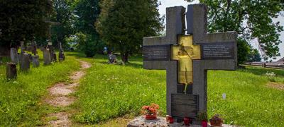 Obnovené pozůstatky zbořeného kostela sv. Martina a pietně upravený zničený hřbitov