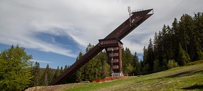 Rozhledna na vrcholu bývalého skokanského můstku, horolezecká stěna, k rozhledně vede lanová dráha.